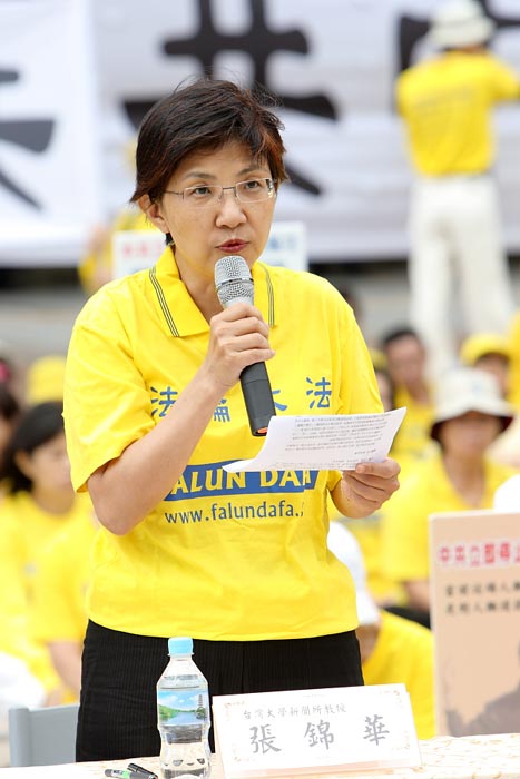 法轮功学员张锦华现任台湾大学新闻研究所教授,她以三鹿毒奶事件为例,说明企业胆敢草菅人命的态度,正是中共体制的缩影。她指出,选择退离黑心集团乃是具有良知正义者之所应为。自二零零四年迄今四年,海内外中国人已有四千五百万人声明退出中国共产党(及共青团和少先队,合称为三退),这个退党浪潮波澜壮阔,中国民心思变,是不可忽视的历史大潮。张锦华以她新闻专业的角度呼吁台湾媒体发挥天职,报导中共退党大潮所代表的善良人士的正义,以及未来中国人真正的希望。