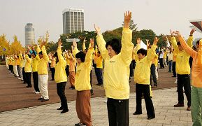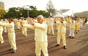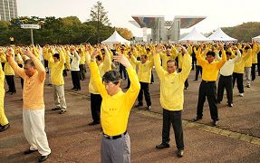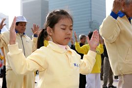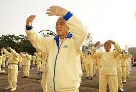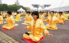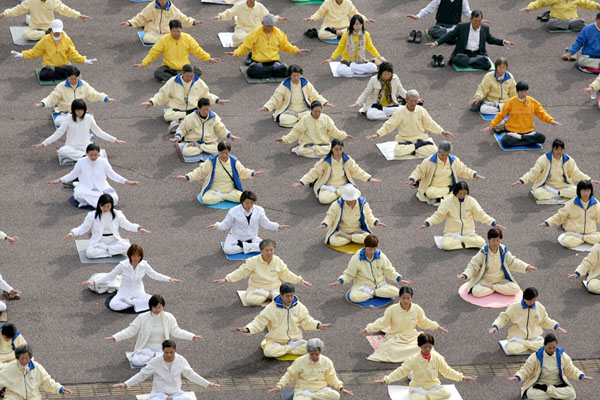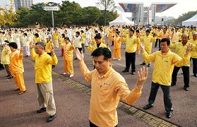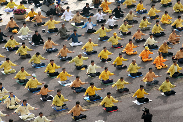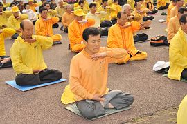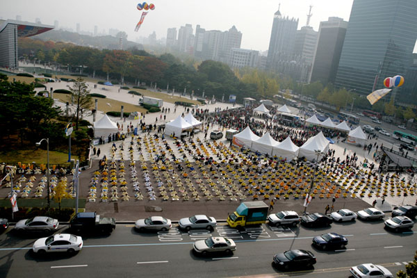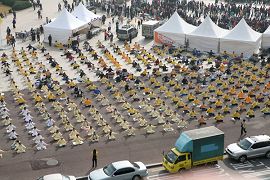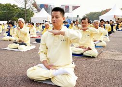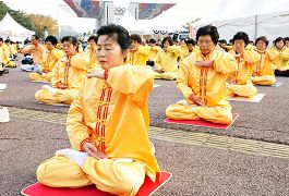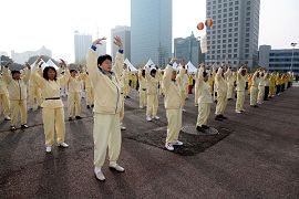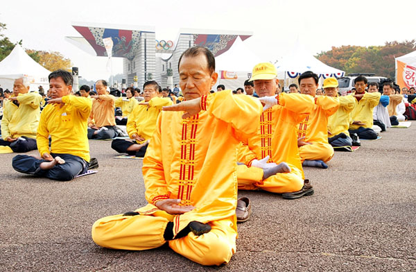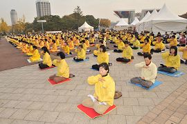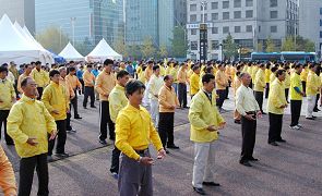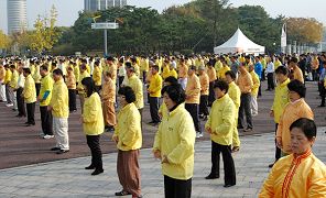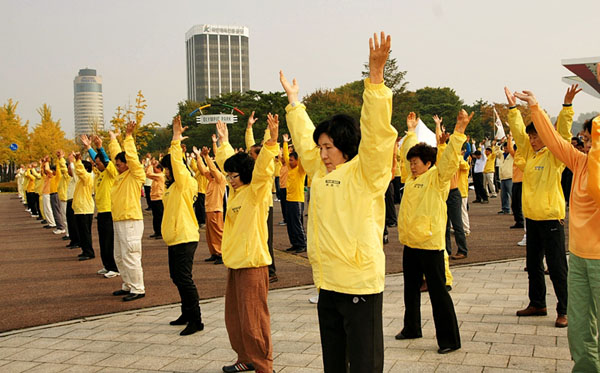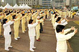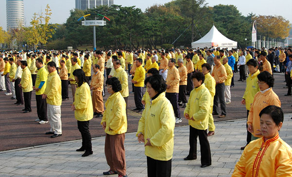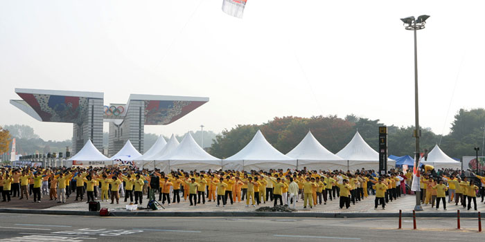 次日,法轮功学员来到首尔奥林匹克广场,展开集体大炼功,图为学员炼功场面。