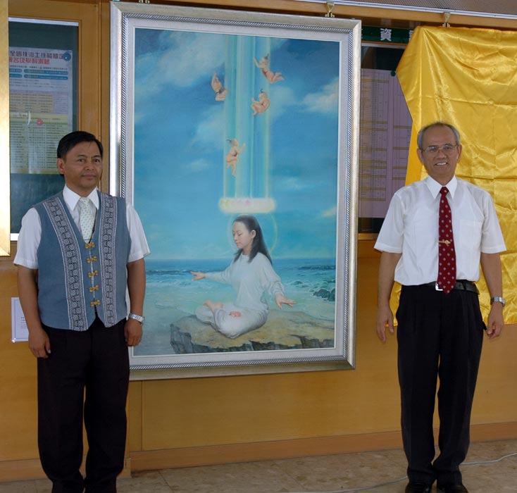 【明慧网二零零八年十一月五日】「真善忍国际美术巡回展览」二零零八年十一月三日在台湾屏东县国立内埔高级农工职业学校展出。内埔农工校长郑越庭、玛家乡乡长陈生明、黎明国小校长胡坤璸、竹田国中校长徐一帆、口社国小校长石进益、北叶国小校长戴锦花、赛嘉国小校长杨秋南、高雄市五福国中主任张素杏、三地国小主任郑宽亮、内埔农工杨淑女老师、玛家乡秘书林永彬、答给发力美食坊吴阿美、原映排湾族文化寻根协会理事长卡莱凯等嘉宾们到场庆贺,为画展揭开序幕。