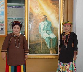 原映排湾族文化寻根协会理事长卡莱凯(左)、答给发力美食坊吴阿美(右)为画作“坚忍不屈”揭幕。