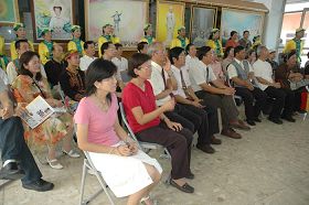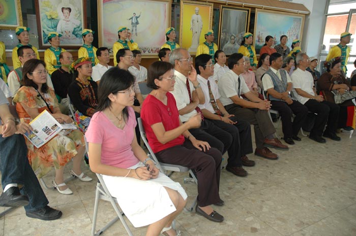 来宾们观赏法轮功真相影片。