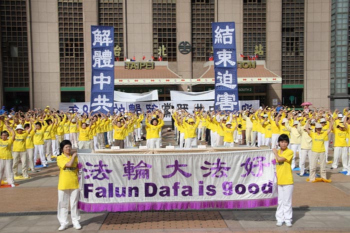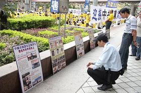 ![]() 台湾法轮功学员在台北火车站以标语横幅和平表达诉求 |