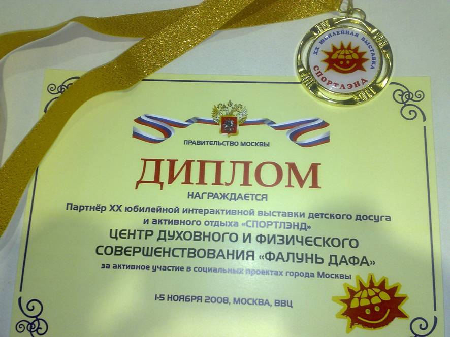 ![]() 法轮大法在俄罗斯儿童体育王国博览会上荣获莫斯科市政府颁发的奖状和奖章。 |