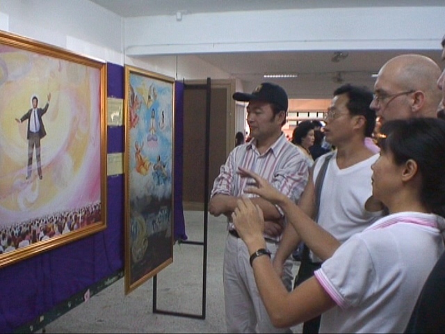 学员向观看画展的观众讲解每幅画的内容,并在现场热情教功。很多有缘人当场学功,其中有年届花甲的老人、天真的孩童,以及僧人、警察等。前来展位的人络绎不绝,有的购买《转法轮》,有的索要大法资料,学员们一边洪法教功,一边向民众揭露在中国大陆中共对法轮功的残酷迫害。明白了真相的人,有的主动留下了自己的联系方式,表达了对法轮功的支持和关注。