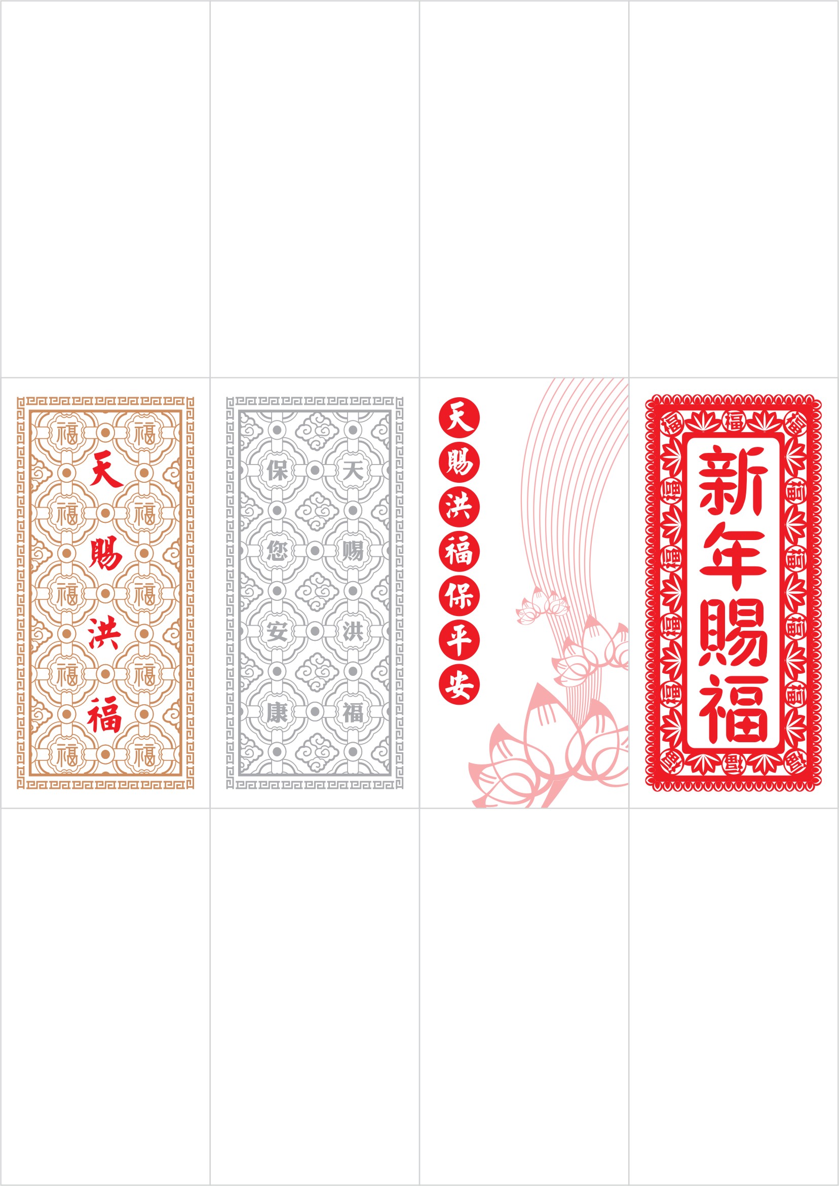 A4普通纸,可供4份小册子用或供两份光盘用。A4纸直接打印,再竖着切三刀,上下对折,完成。(试过了,打印一张速度非常快)用的都是细线条,很省墨。里面还有浅灰,那个图直接用灰度打印更省钱。过年期间需要喜庆一点,所以相比之下,那个红色的是会稍微费点墨。