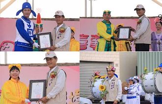 乡长许重明亲自带领乡公所全体工作人员及全乡各社团参与踩街游行,法轮功学员受邀其中,倍增隆重盛大。游行中,乡民热情的接受洪法莲花书签、大法真相材料,惊叹与掌声不绝。