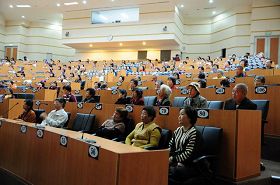 天刚亮,上百部来自全台各地的游览车和小客车就陆续驶进中兴大学,他们着盛装、俩俩相偕走进会场。除了安排主会场--惠荪堂外,另有五处副厅,以容纳庞大数量的学员。会场大厅中心挂着金字红底的《论语》的巨大横幅,两旁则是绿、橘、紫、黄、蓝底色的“法轮图形”横幅,会场内神圣庄严而隆重。