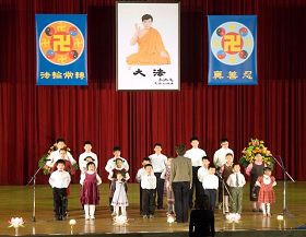 下午的法会在嘉义明慧学校的小同修朗朗的背法声中开始。赖凰真在鼓励小同修背诵《转法轮》持续一段时间后,小同修也能将法溶于生活中:“别人对我不好时,我会忍耐,不跟他计较及主动帮助同学和老师,要做一个好人,才能够返本归真,并且让大家都知道‘法轮大法好’”。