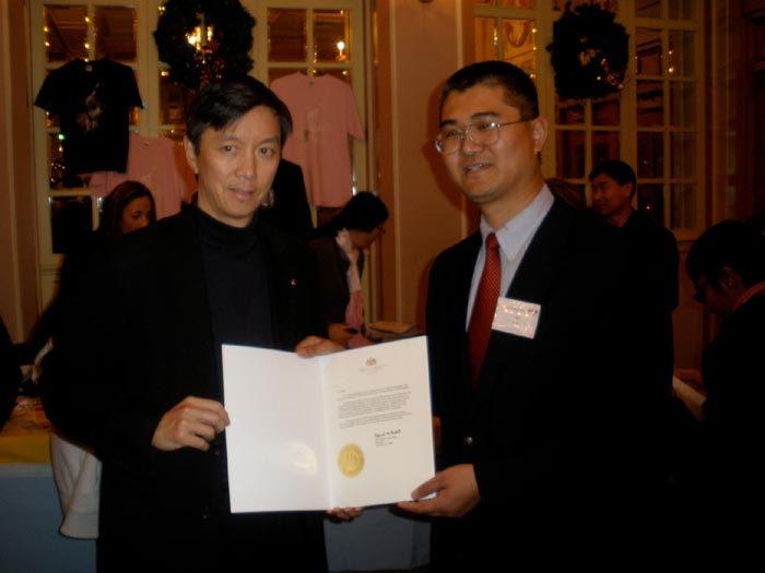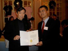 ![]() 宾夕法尼亚州政府官员安德鲁宾陶艺(Andrew Toy)(左) 专程送达州长给神韵艺术团的褒奖状 |