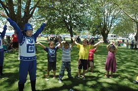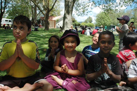 游行结束后,天国乐团的法轮功学员,在公园的树荫下集体炼功,吸引了很多孩童来学功。他们一开始在学员身后,随着比划动作。后来,有的学员注意到他们,就教他们学功,孩子们学的很认真,很开心。