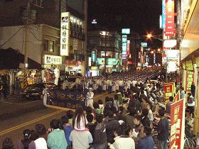 在踩街的活动中,天国乐团队员们穿着中华传统服饰,带领着花莲各界六十几个参加踩街活动的队伍。