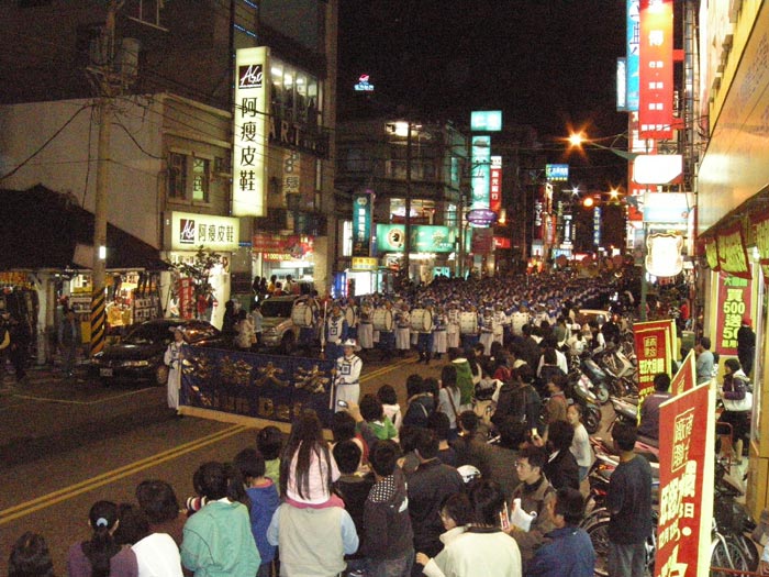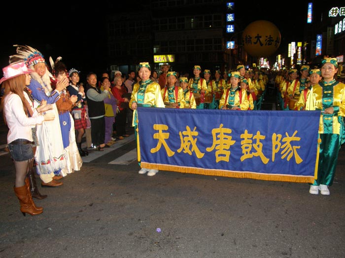 在踩街活动中,开场带领队伍是天国乐团,队员们穿着蓝白相间的中华传统服饰,整齐划一的行进,吹奏着「法轮大法好」、「法鼓法号震十方」、「法正乾坤」、「欢乐颂」等乐曲,感动着每一位沿途观赏的群众,同时也吸引了各界媒体的目光,更赢得了人们的喝彩与热烈的掌声。