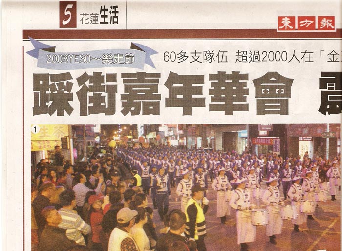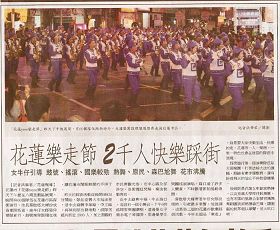 台湾联合报大篇幅报导天国乐团参加花莲踩街受欢迎的盛况。
