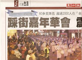 花莲地方东方报大版面的报导,天国乐团参加踩街游行的整齐画面,吸引群众的目光。