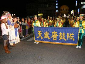 在活动中压轴的队伍,是来自台湾台东、嘉义的法轮功学员所组成的“天威唐鼓队”,成员年龄层横跨七岁到七十五岁,他们神情专注敲着鼓棒,齐整如一的行进在「法轮大法好」的乐声中,队伍中还冉冉升起了一颗纯黄色的「法轮大法好」大气球,看起来相当醒目耀眼,不但让沿街的观众拍手叫好,更让在场的每位观众看到也跟着一起喊出「法轮大法好」。