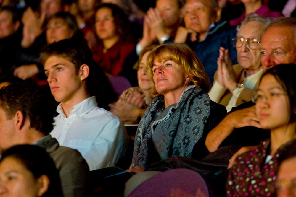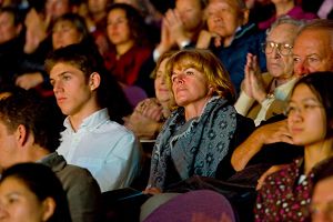 萨拉索塔首场晚会中,被引人入胜的节目内容深深打动的观众。