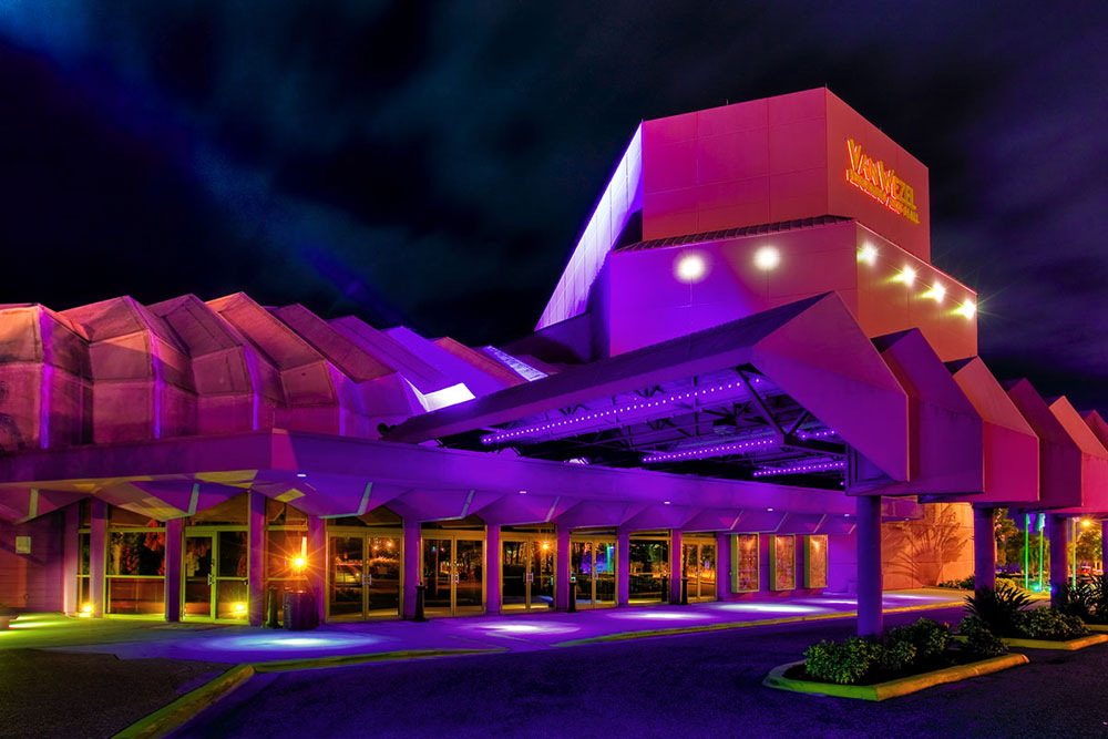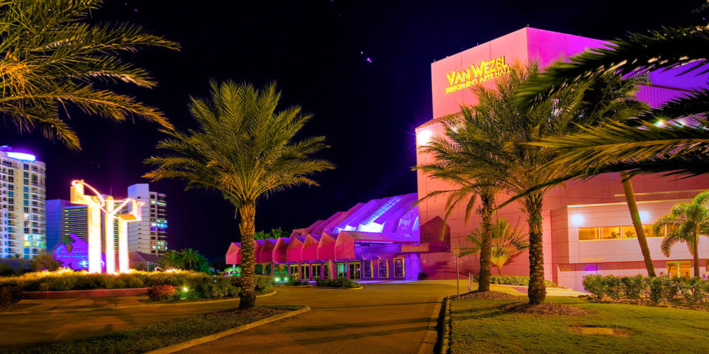 Van Wezel表演艺术大厅是佛罗里达州西南海岸线上美丽的海滨城市萨拉索塔(Sarasota)最高档的剧院;表演艺术大厅室内外都是优雅迷人的紫色,被当地人称为“紫雾”。