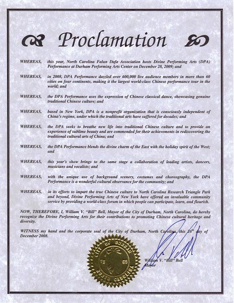 北卡州第四选区国会议员大卫·普莱斯预祝二零零九年神韵巡回演出成功。普莱斯在贺信中表示:“我很高兴神韵艺术团十二月二十八日将在杜尔文表演艺术中心上演享誉世界的艺术。四大洲的六十多个城市、六十多万观众见证了表演的优雅和力量。杜尔文市能成为其中的一员,感到很自豪。”普莱斯还说:“神韵独特的天幕布景、服装、编舞产生的壮观效应,帮助我们了解到中国的传统艺术。在神的庇佑下,三角区的民众能接触这些美好文化并为之感动。”