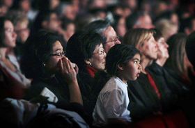 ![]() 二零零八年十二月二十七日,咨商心理师文蜜(Winmi)(右)与伊莲恩索(Elaille)(左)观看了神韵国际艺术团在美国圣地亚哥市政剧院的演出 |