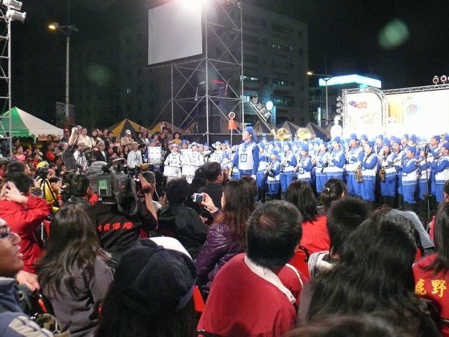 晚间各踩街队伍轮番上台进行定点表演,天国乐团在群众安可声中,共演奏《法轮大法好》、《法鼓法号震十方》、《法正乾坤》、《送宝》、《佛恩圣乐》等五首乐曲,民众轻轻打着拍子,专注的听着祥和的乐音,每首曲子结束,便爆出如雷的掌声。