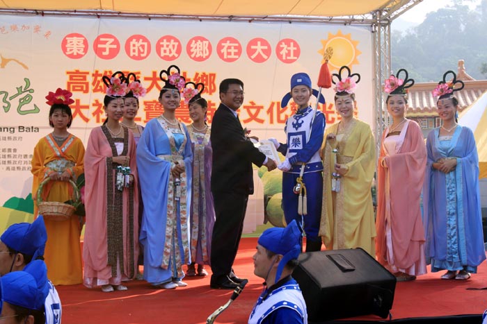 大社的三宝农特产是以有机栽培的蜜枣、芭乐和牛奶,品质优良闻名全台,每年的十二月到二月是蜜枣和芭乐的产收期。大社乡观音山是高雄有名的佛教胜地和风景区,大觉寺观光客很多。三宝农特产文化观光季就是在大觉寺前方广场举办,人潮汇集。天国乐团队伍进入会场,马上吸引大家的目光,纷纷报以热烈掌声。乐团演奏《法轮大法好》、《圣诞铃声》、《法轮圣王》等乐曲,场面庄严感人。在场除了乡长外,还有陈启昱立委、凤山市许市长等官员,都专注聆听天国乐团的演奏。随后,法轮功学员组成的腰鼓队步上舞台演奏《法轮大法好》、《鼓乐神威》等曲目,民众纷纷报以热烈掌声。
