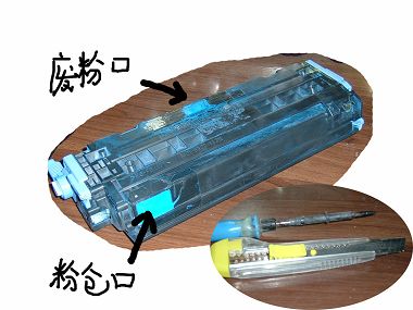 4:硒鼓开洞方法;取出硒鼓,两个小把手对向自己,鼓芯上方是废粉仓,在中间开洞,1平方厘米就行。粉仓开洞位置在右端,大小同废粉仓。