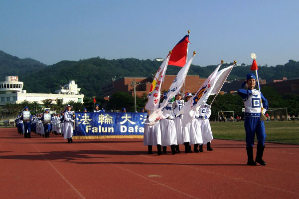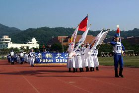 开幕典礼中,五名身穿木兰装的掌旗官,分掌国旗、市旗、局旗、志旗及IAVE旗(国际志工总会旗),以整齐的步伐居先前导;其后由「法轮大法」横幅及天国乐团引领所有参赛队伍进场。当「法轮大法好」气势磅礴的乐声响起,在场的志工们不由的精神大振、志气昂扬。
