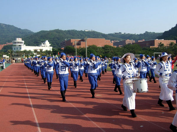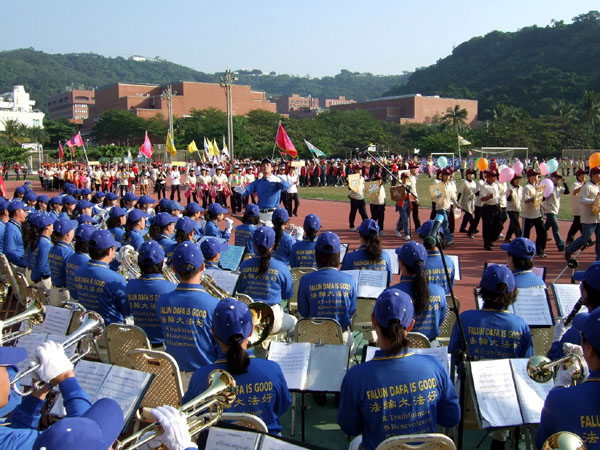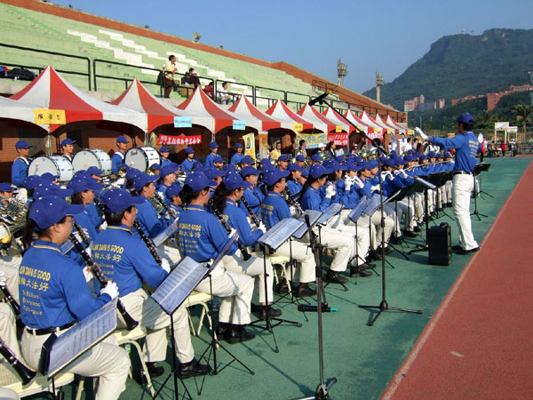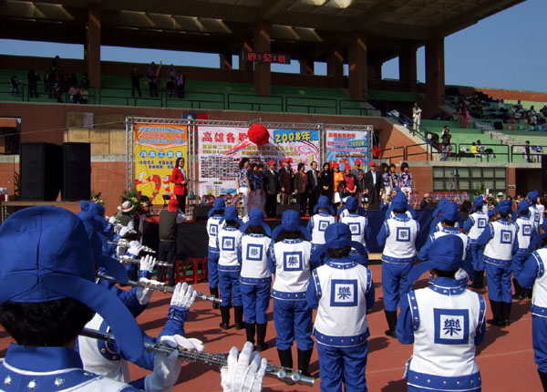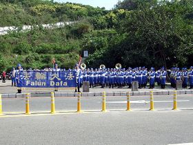 比赛正式开始,大会乐队留在现场担任伴奏;引领乐团则移师至西子湾景点,于英国领事馆登阶入口旁广场吹奏:「法轮大法好」、「法鼓法号震十方」、「法正乾坤」、「欢乐颂」、「佛恩圣乐」、「送宝」、「法轮圣王」……天国乐团满怀真诚祝福,将一首首乐曲送给往来的台湾游客及大陆观光旅行团。天国乐团同时向观光客推介神韵艺术团全球巡演的讯息,希望大家明白法轮大法的美好,更能观赏到神韵精彩的表演。