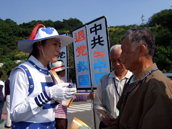 ![]() 天国乐团团员向大陆观光客介绍大法真相,及神韵世界巡演讯息。 |