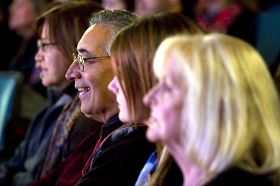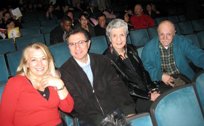 丹尼斯•阿沃德(Dennis J Awad)(左二)与朋友Angela Rohan女士(左一)一同前来观赏神韵在洛杉矶的首场演出。