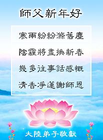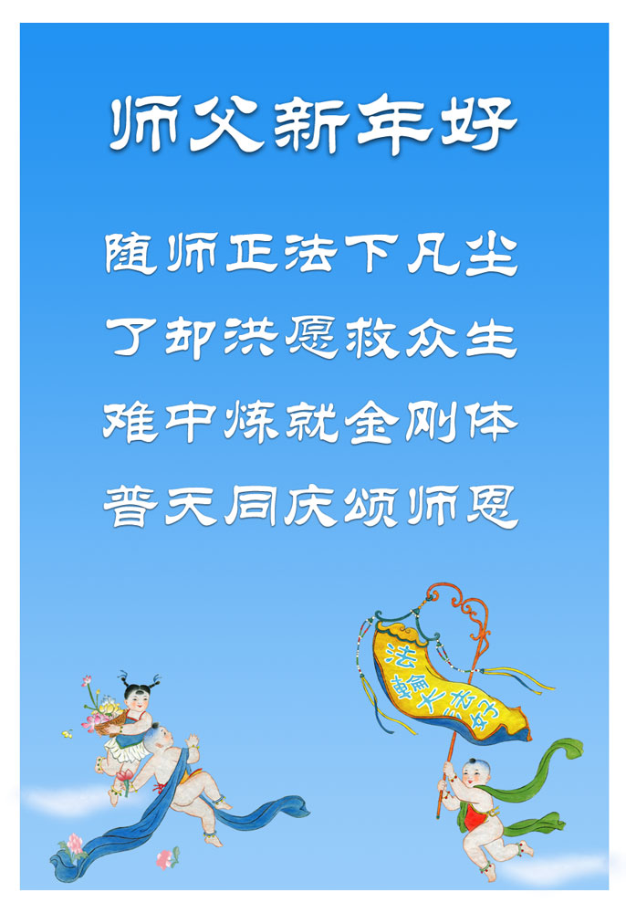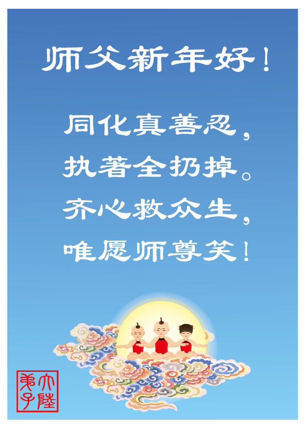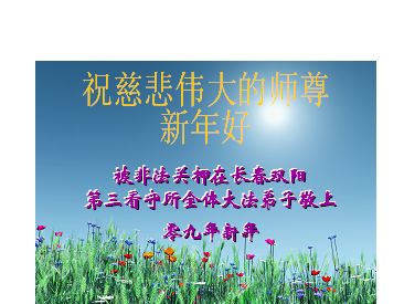 新年即将来临了,我们向伟大的师尊拜年:师尊新年好!您把这方的众生交给我们救度,我们一定会努力做好,不辜负师尊的重托,请师尊放心。我们听师尊的话,修好自己,共同配合做好三件事,走好最后的路。