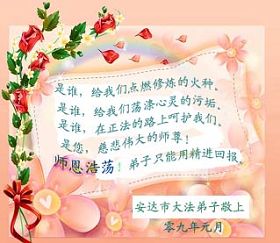 敬爱的师尊:2009新年来临之际,淮北市全体大法弟子恭祝您新年快乐!愿师尊在新的一年里多一些欣慰,少一些操劳!