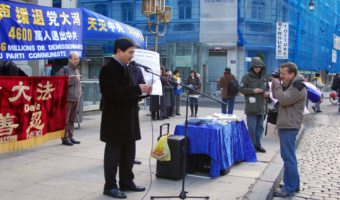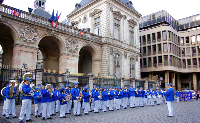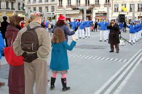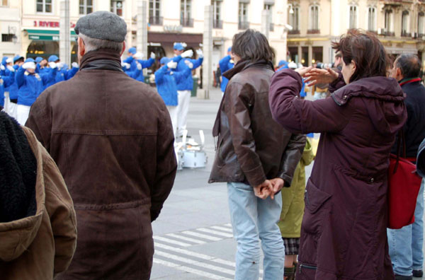 集会是在原定召开欧中峰会的里昂市喜剧广场开始。首先欧洲“天国乐团”在广场上演奏“法轮大法好”等几首歌曲,围观的民众逐渐增多。