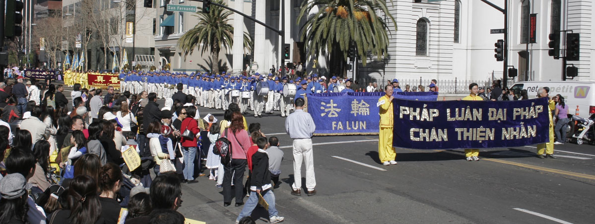 ![]() 法轮功学员手持的横幅上用越南文写着:“法轮大法,真善忍”。 |