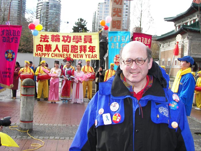 代表四万二千个医院雇员的工会主席Fred Muzin先生,特意留在广场与法轮功学员在一起,表示支持并祝大家新年快乐。Fred Muzin先生说:“我曾写信给组委会要求接受法轮功学员的申请,但没有结果。我留在这里是表示对法轮功学员的支持,因为我看不出来有什么合适的理由拒绝他们。对中国新年的庆祝,是那么的绚丽多彩,它已经成加拿大多元文化的一部份。可以拥抱不同的文化,这就是加拿大为什么这么强大。”