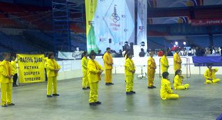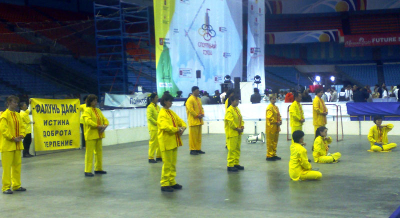 博览会场里,莫斯科法轮功学员进行功法展示