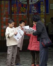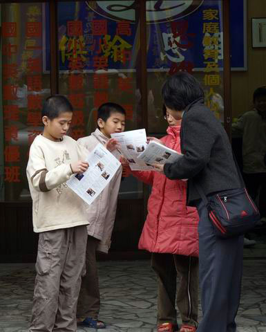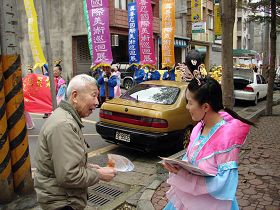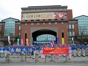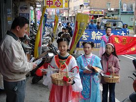 【明慧网二零零八年二月十八日】(明慧记者黄宇生采访报导)二零零八年二月十六日,正月初十,仍是传统习俗的新年,台湾连日来罕见的低温终于解除,天空绽露久违的阳光与晴空。一群穿着古代服饰的仕女、仙女及小孩组成的腰鼓队、及精神抖擞的天国乐团浩浩荡荡的穿梭在桃园中坜、平镇的大街小巷,宣传车不断的放送着「真善忍国际美术巡回展览」的讯息,让市民感受到过年般的喜气与热闹。许多市民高兴的接下传单及「新年快乐」的问候后,有的于下午便带着家人孩子前来观赏美展。