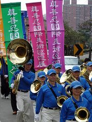 壮观精神抖擞的天国乐团在桃园中坜、平镇的大街小巷,传递「真善忍国际美术巡回展览」的讯息,让市民感受到过年般的喜气与热闹