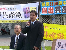 南王国小主任高伟光也特别赶来参加声援活动,他强调教育的本质是真诚、自由、平等、善良,但中共的暴力、谎言、邪恶斗争却只会将人类带到道德下滑、悲惨的境地。高伟光说,在中国共产党统治中国的这几十年来,谎言、血腥暴力伴随着一次又一次的镇压运动,但表面上却总在粉饰虚假的太平。震惊全世界的“六四”天安门事件,中共对学生开枪,直到目前仍说是学生暴徒攻击解放军,天大的谎言只证明这十几年来中共没有改变。因此他声援中国人退出共产党、共青团与少先队,迎接自由的明天。