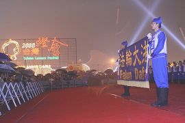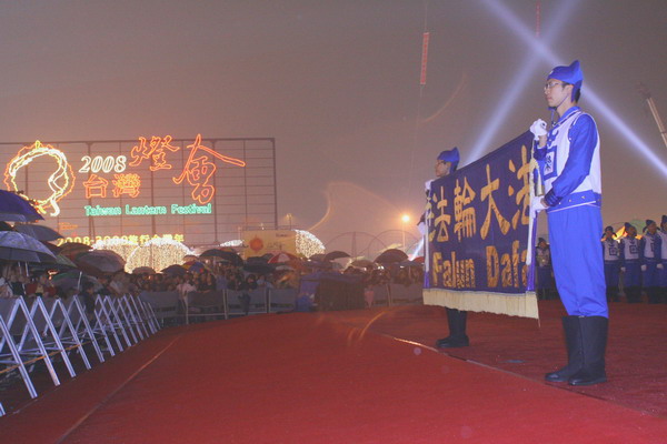 台湾灯会期间,每晚均安排舞台节目演出。周末的天空虽然间歇的飘着雨,民众仍不断聚集围绕主舞台周边等待表演,首先由新唐人旗鼓队揭开序幕,接着主持人介绍近三百名来自全省各地、多阶层的男女老少组成的天国乐团出场,身着中国古代深浅两款古装、手持西洋鼓乐器的团员,一亮相即吸引了民众的目光。