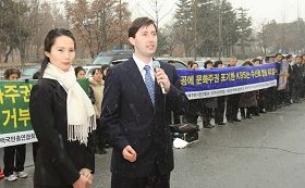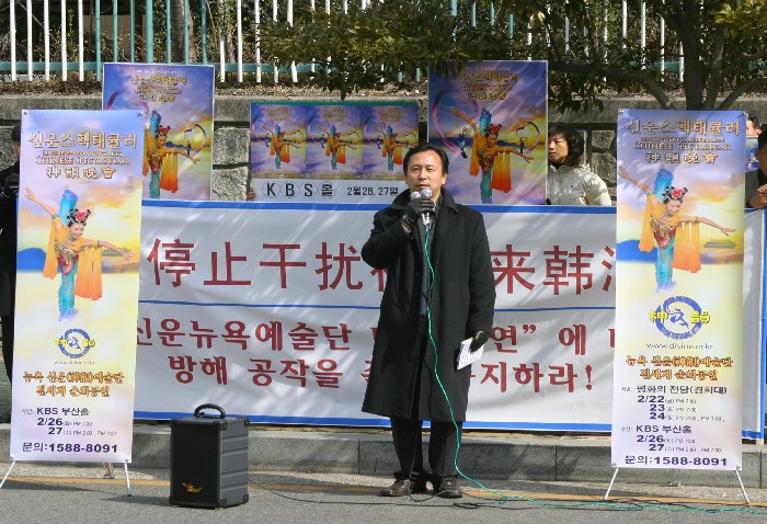 为了呼吁新政府正视作为自由民主国家、文化演出自由不应被中共干扰,韩国法轮大法学会、索纳塔艺术企划、反腐败追查联合会、民主市民联合、司法改革国民联盟、活贫团、CIPFG韩国分部、国家危机紧急对策国民总联合会等数十位民间团体代表,于二月二十五日下午,在韩国国营电视台KBS首尔总部前,举行新闻发布会,抗议和谴责中共干涉韩国文化表演自由,施压KBS取消租借美国神韵艺术团在釜山演出的剧院;要求KBS釜山剧场按期履行原定契约。美国神韵艺术团副团长李维娜以及主持人之一的唐瑞也出席发言。