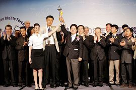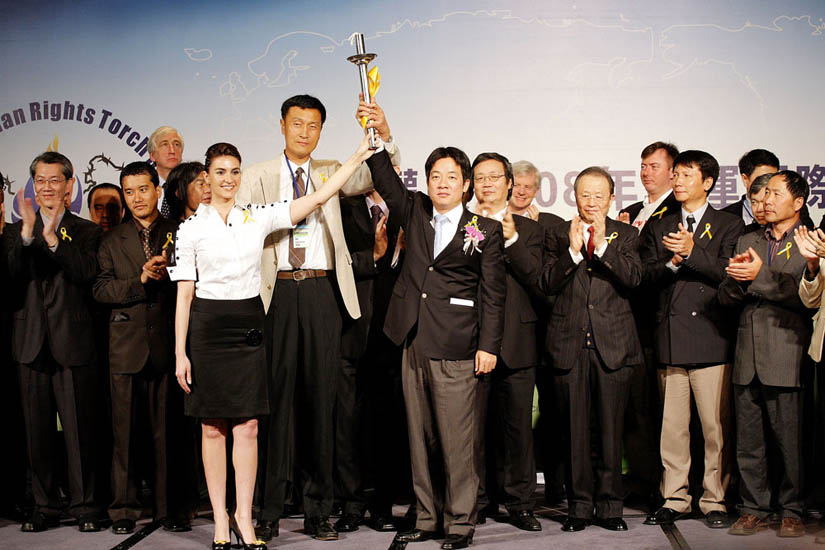 ![]() 美西人权圣火大使,前中国国家篮球代表队员陈凯(中)、二零零三年加拿大小姐(左)和台湾立法委员、CIPFG亚洲分团团长赖清德(右)二十二日在「中国人权与二零零八年奥运国际论坛」新闻发布会上高举人权圣火。 |