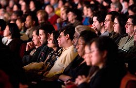 二零零八年新唐人全球华人新年晚会在纽约无线电城的周六晚场演出中,精彩纷呈、高潮迭起,现场观众为之倾倒、陶醉,坐在记者前排的白人约翰一家四口随晚会的节目情节而乐而忧。