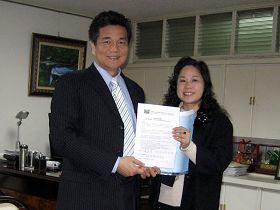 ![]() 台中县梧栖镇镇长陈廷秀(左)加入全球百万连署 |