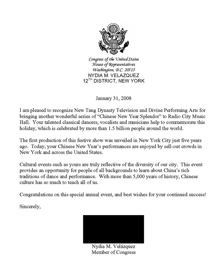 【明慧网二零零八年二月六日】(明慧记者周杉编译报导)纽约州第十二选区国会议员Nydia M. Velazquez,一月三十一日在神韵新年晚会在纽约市无线电音乐城上演的第二天,向新唐人电视台和神韵艺术团颁奖,赞叹演出为人们提供了了解中国传统文化的机会。褒奖令全文如下: