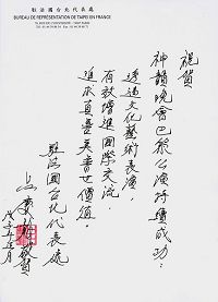 ![]() 驻法国台北代表处吕庆龙题词,赞叹“神韵晚会”追求真善美普世价值,并祝其巴黎演出持续成功。 |