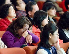 ![]() 神韵纽约艺术团于二零零八年三月九日首日在台中中兴大会堂开演二场,许多观众被神韵演员精湛的演出感动落泪。 |