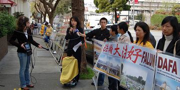 【明慧网二零零八年三月十五日】(明慧记者王英旧金山报导)三月十四日中午,旧金山法轮功学员在中共领馆前集会,抗议中共借举办奥运之机,大肆抓捕修炼真善忍的法轮功学员,同时呼吁民众了解中共本质,帮助制止在中国持续了近九年对法轮功学员的残酷迫害