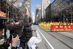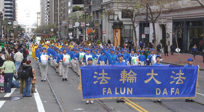 旧金山圣帕翠克日游行今年是第一百五十六届。一百多个来自各地的游行团体,沿旧金山Market大道行进,法轮功的美西天国乐团受人瞩目,雄壮的军乐震撼人心。