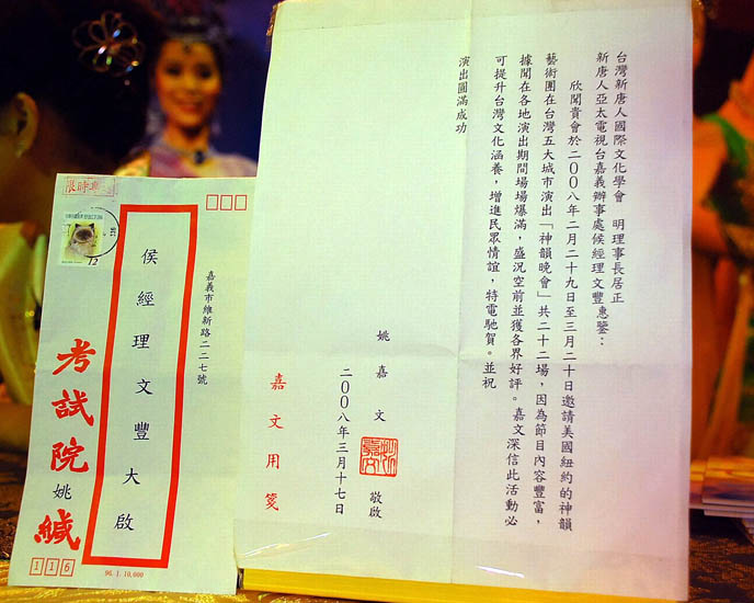 【明慧网二零零八年三月二十一日】(明慧记者王清汉台湾嘉义报导)神韵纽约艺术团巡回台湾五大城市,演出二十二场,润泽四万观众,于三月二十日在嘉义国立中正大学晚场落下帷幕,圆满完成传播神传文化的台湾艺术之旅。考试院院长姚嘉文特致贺电,赞扬神韵可提升文化涵养,嘉义县议会议长余政达致赠“技艺高超”的匾额。在结束表演的茶会上,各界纷纷表示感谢神韵纽约艺术团远道而来,把纯善纯美的艺术散播给云林、嘉义、台南的民众。